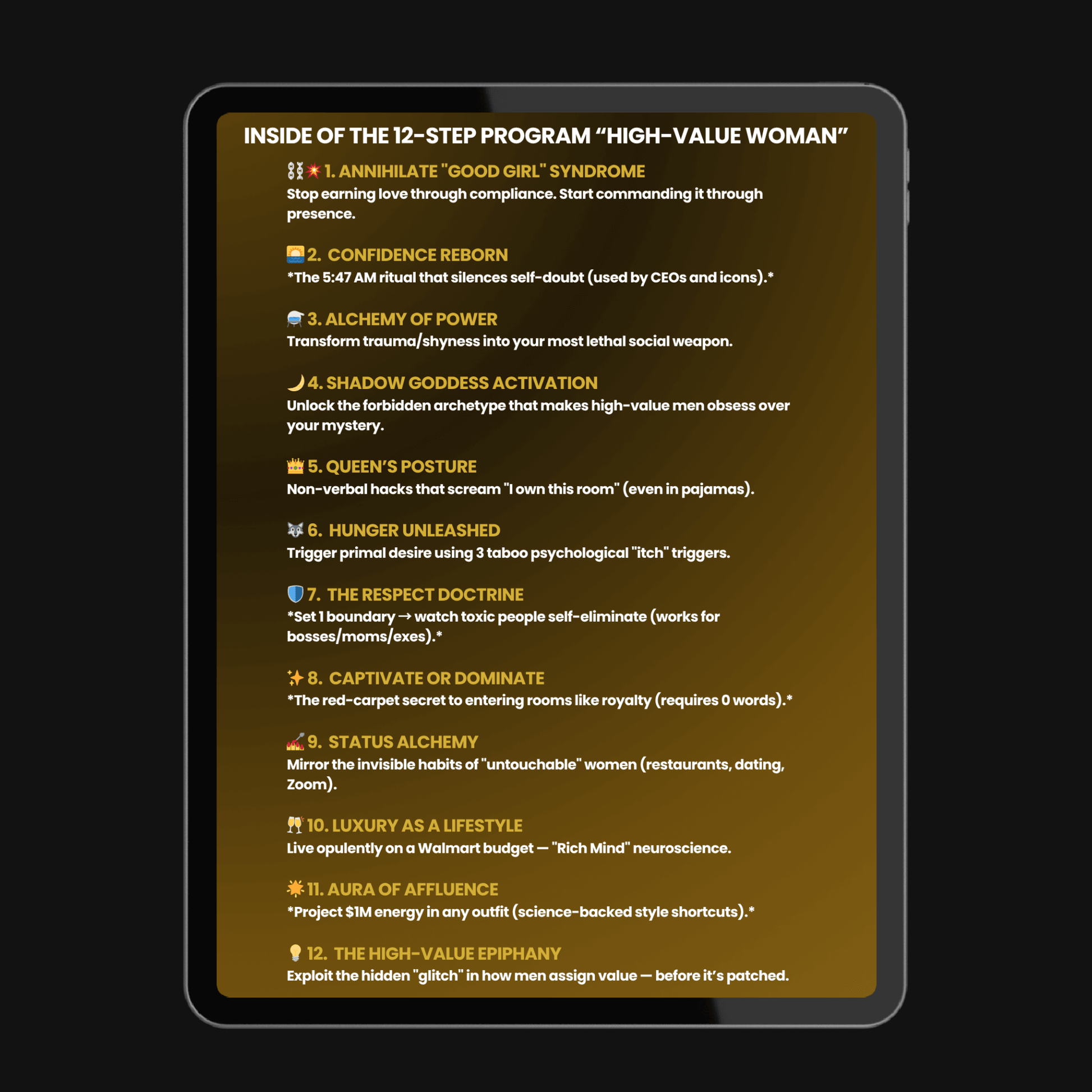 This is your 12-step blueprint to fundamentally rewire your self-worth. You will build the unshakable confidence, radiate the magnetic energy, and project the quiet authority that makes high-quality men naturally gravitate towards you. Before you can command respect, you must first embody it.